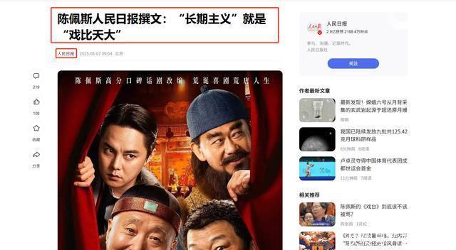 今年8月,他的的文章《“ 长期主义”就是“戏比天大 ”》在《 人民日报 》发表,引起了巨大的轰动。 “ 陈佩斯这是把天花板捅穿了! ”、“ 人民日报都盖章了,还有谁不服? ””言论,可谓是层出不穷。