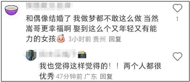 许是多日爆料脱敏成功的原因,不少粉丝已经默认两人结婚事实,还纷纷祝福了起来。有粉丝表示和偶像结婚像做梦一样,也有粉丝认为许嵩能娶到年轻有能力的女孩子也很幸福。