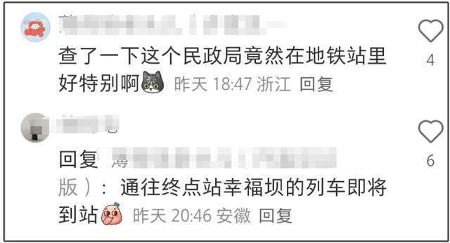 爆料网友是合肥IP,不少网友认为可信度大增。幸福坝是合肥地铁站的一个站名,当地民政局在该站有结婚登记专区,而该站的广播通知是“通往终点站幸福坝的列车即将到站”,不论从寓意还是形式都很特别,结婚的目的是幸福,新人在幸福坝终点站登记,既是到了终点,也是新起点。